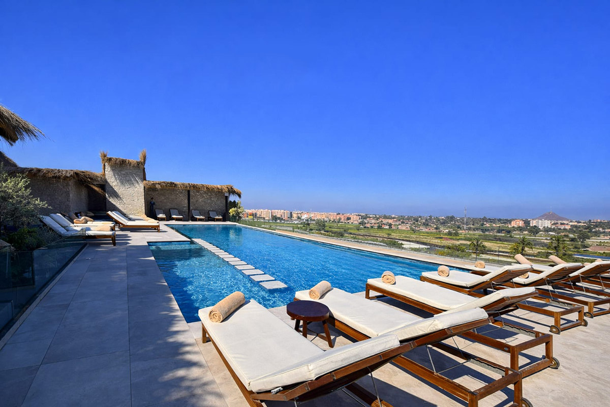 A chic swimming pool that refreshes and soothes during the heated days of Marrakech, a comfortable shelter for contemplating the magical beauty of the landscape of the imperious Atlas Mountains.